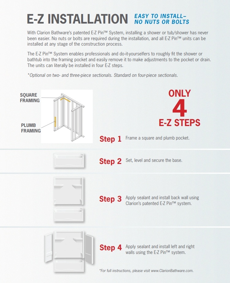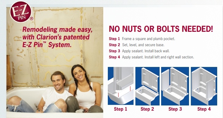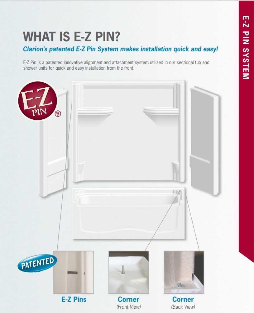 E-Z Pin system makes installation quick and easy! E-Z Pin is a patented innovative alignment and attachment system used in our sectional tub and shower units for quick and easy installation from the front!