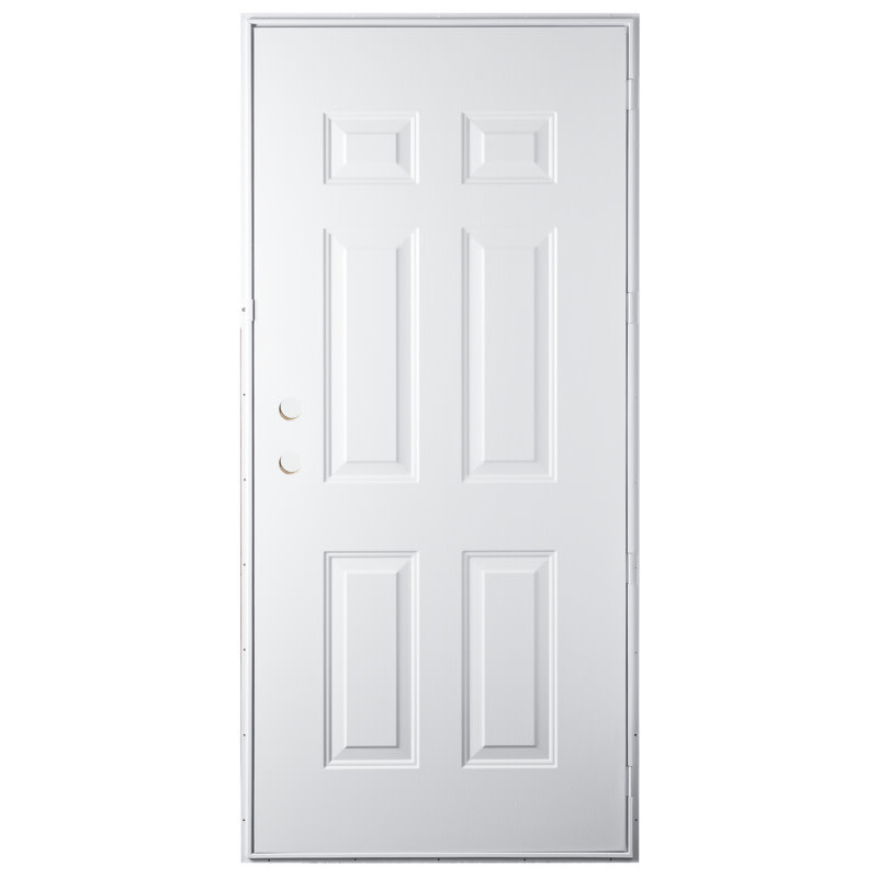 White painted galvanized steel mounting frame. 1-3/8” door thickness. Core is edge bored, capped and face drilled for dead bolt. 4-Lite and 9-Lite style option also available. Full perimeter compression gaskets and seals. 6-Panel design. Polystyrene foam core insulation. 4 extruded hinges with bushings.