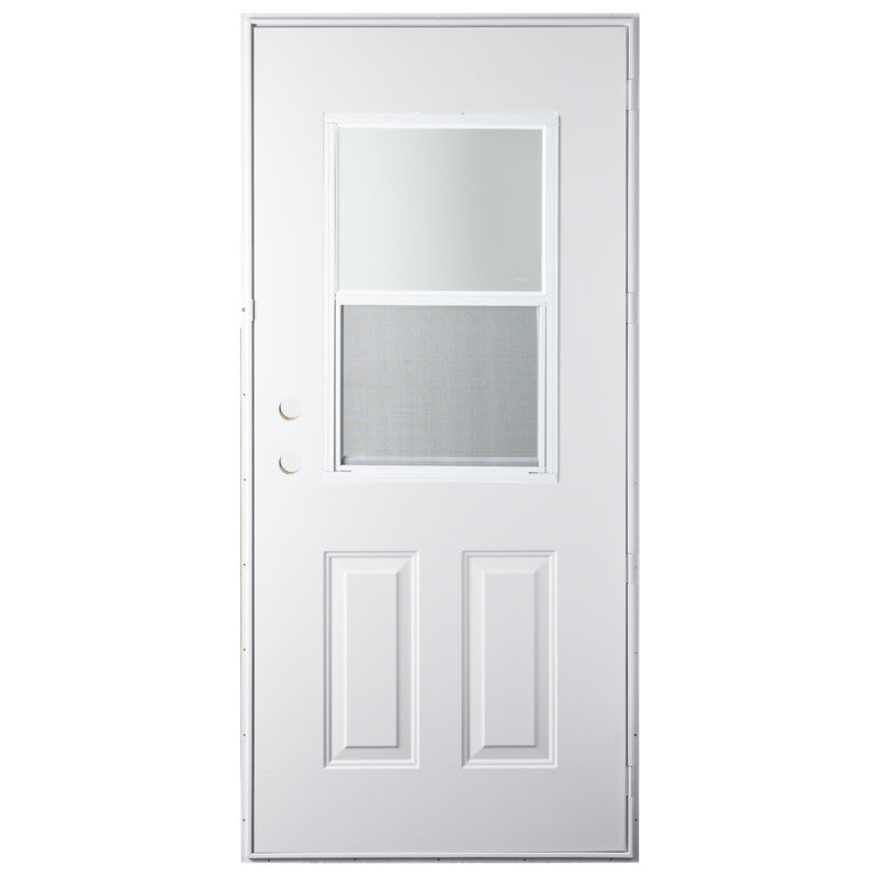White painted galvanized steel mounting frame. 1-3/8” door thickness. Core is edge bored, capped and face drilled for dead bolt. 4-Lite and 9-Lite style option also available. Full perimeter compression gaskets and seals. 6-Panel design. Polystyrene foam core insulation. 4 extruded hinges with bushings.