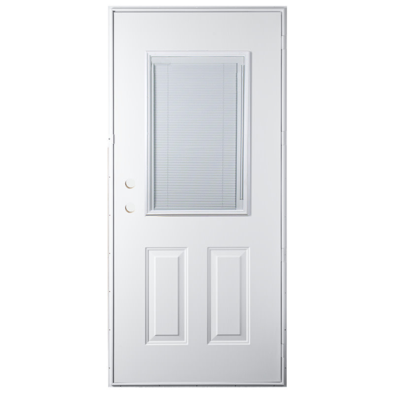 White painted galvanized steel mounting frame. 1-3/8” door thickness. Core is edge bored, capped and face drilled for dead bolt. 4-Lite and 9-Lite style option also available. Full perimeter compression gaskets and seals. 6-Panel design. Polystyrene foam core insulation. 4 extruded hinges with bushings.