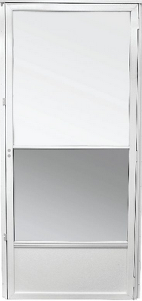 Z-bar drip cap. Full length galvanized hinge pin. Safety glass. Fiberglass screening. Top quality hardware available but not included. Kick plate.